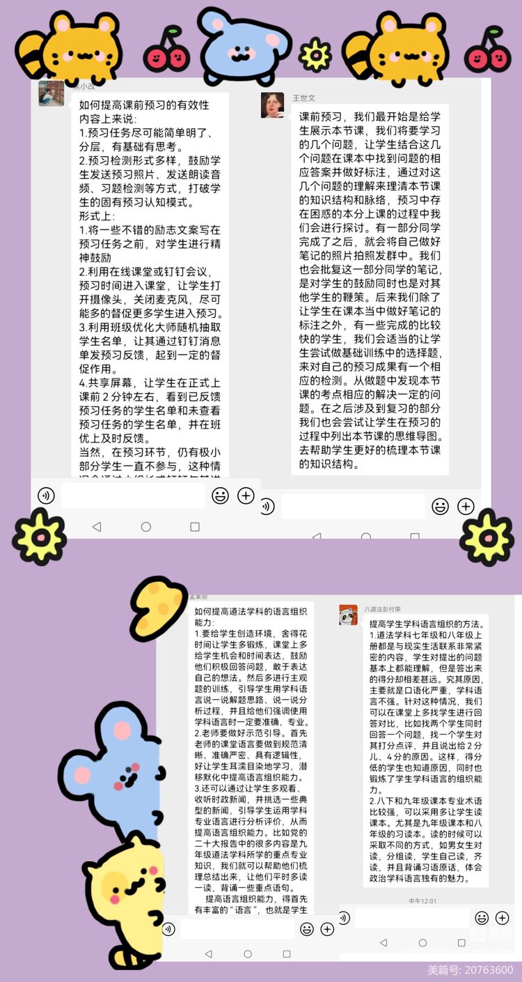 本周语文组针对网课中晨读晚背课中存在的问题和好的做法进行交流探讨。探讨后教师们提出,首先课前发动组长力量进行统计,家校结合;其次通过当堂提问,即对准摄像头、闭眼背诵的方式模拟真实课堂展示,发挥聚焦作用;尝试不同的作业形式,如字词小报、绘制西游路线图、视频背诵、智学网朗读等形式,提升对基础知识的掌握。