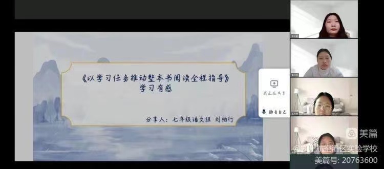 语文组教师分享交流整本书阅读的方法指导,从导读、促读、展示三个环节展开,设计激趣课、概览课、阅读计划课、方法指导课等八大课型对学生进行指导。结合项目式学习在进行整本书阅读时,给学生设定一个场景或方案,让学生形成自己的知识成果。在展示的过程中,给予学生不同方式的评价,从而引导学生进行系统的阅读。