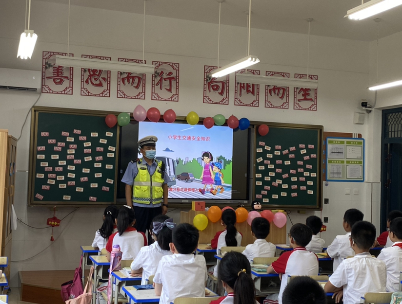 通过交警叔叔的讲解,同学们进一步增强了交通安全意识,知道了在步行时一定要遵守信号灯、在马路上不能使用轮滑设备、年龄不满12周岁不能骑自行车上路、乘车时不能将手或身体伸出窗外、不能影响家长安全驾驶等常见的交通安全常识。