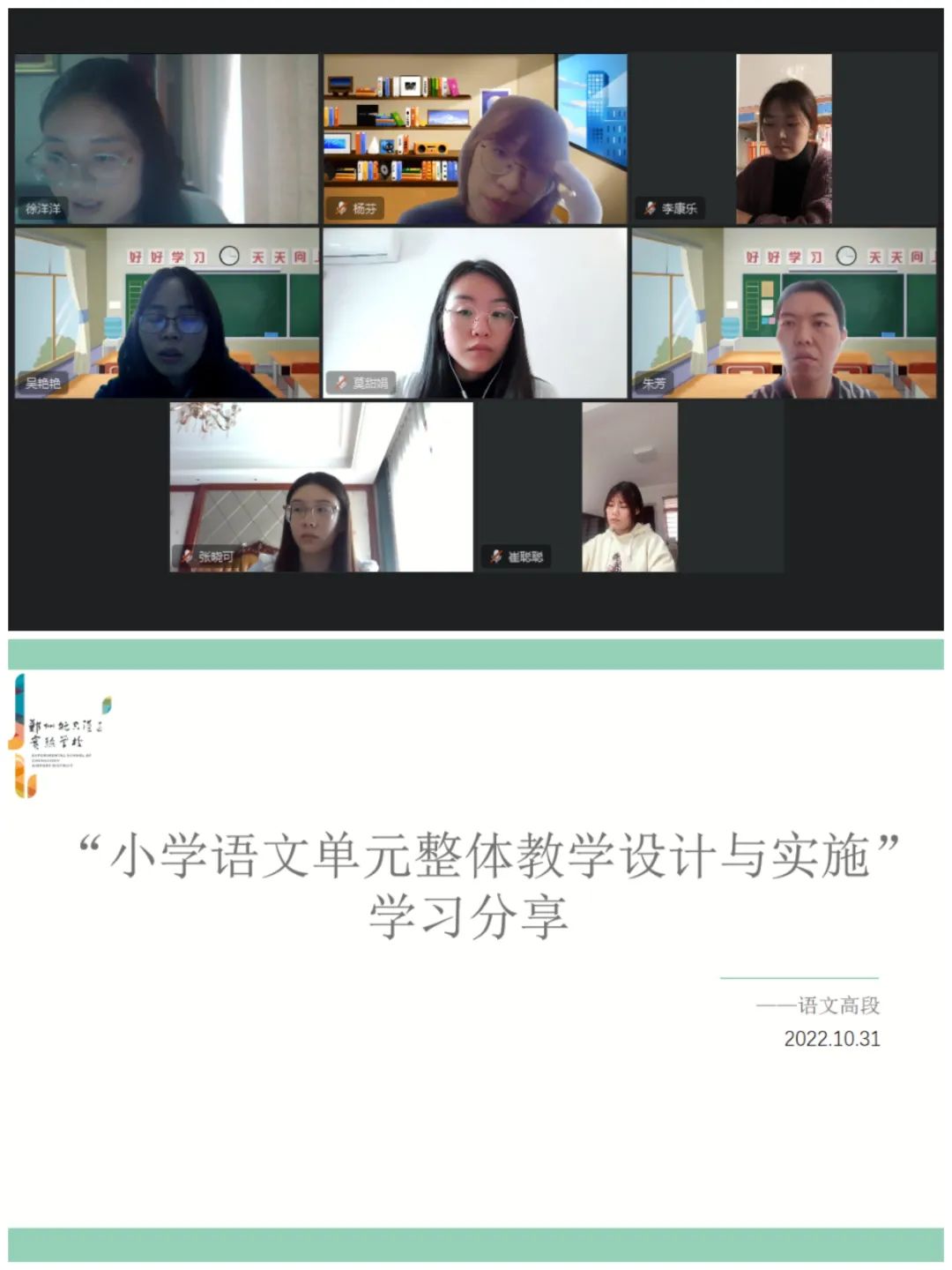 屏幕前,老师认真聆听、用心记录,力求将所学到的理论知识有效落实到教学实践中。讲座结束后,语文组以学段为单位展开了集体教研,老师们对单元整体教学设计有了更深的认识,纷纷进行感想交流,分享自己的收获。